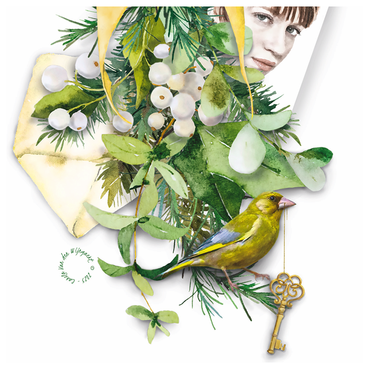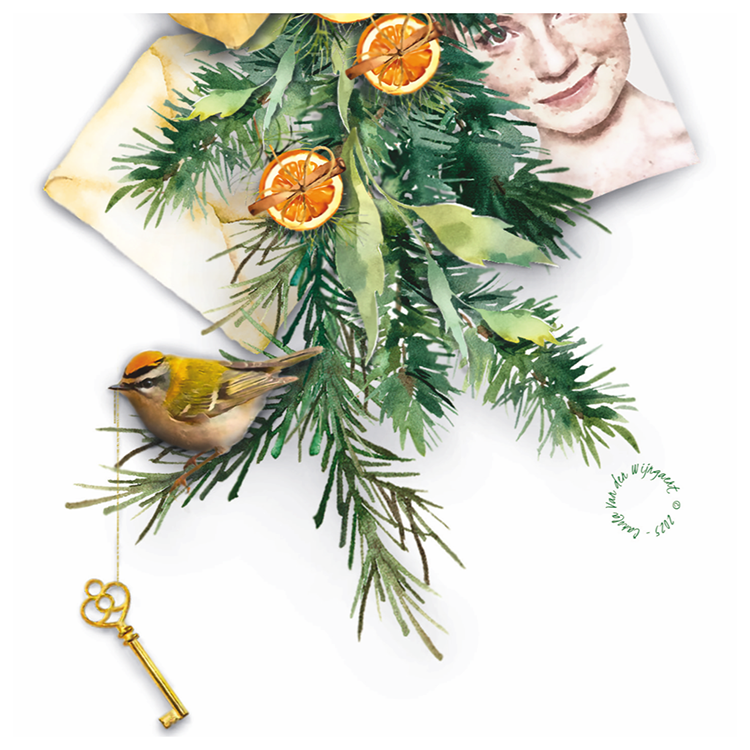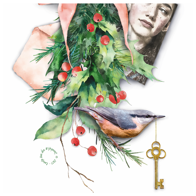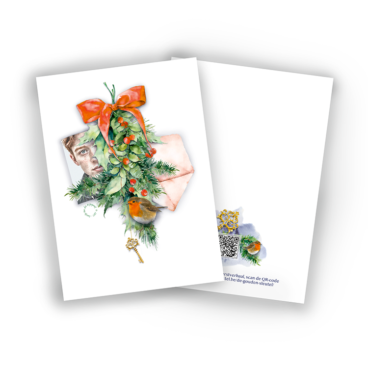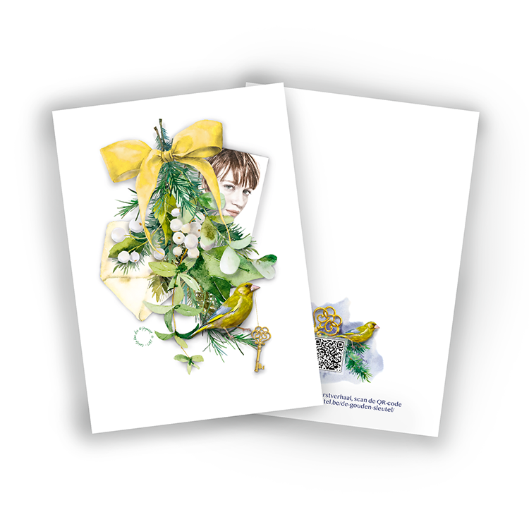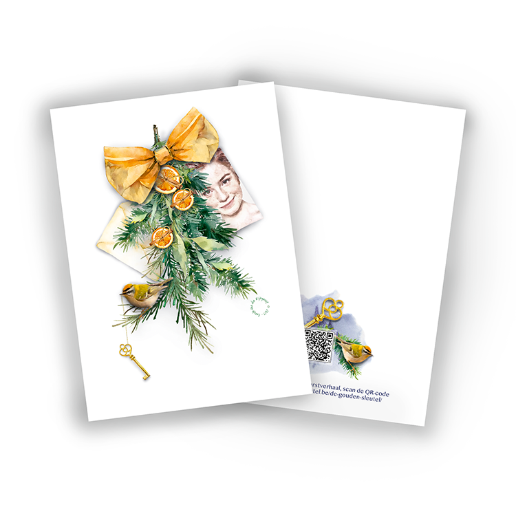 Dit jaar wou ik mijn kerstkaarten een vleugje extra magie meegeven! Daarom staat op de achterzijde van elke kaart een link/QR-code die leidt naar De Gouden Sleutel — een geïllustreerd kerstverhaal over de excentrieke oma Clara en haar kleinkinderen.