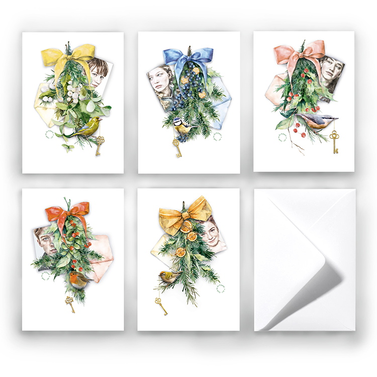 Deze set bevat 10 postkaarten (2×5 verschillende tekeningen) met bijpassende enveloppen.